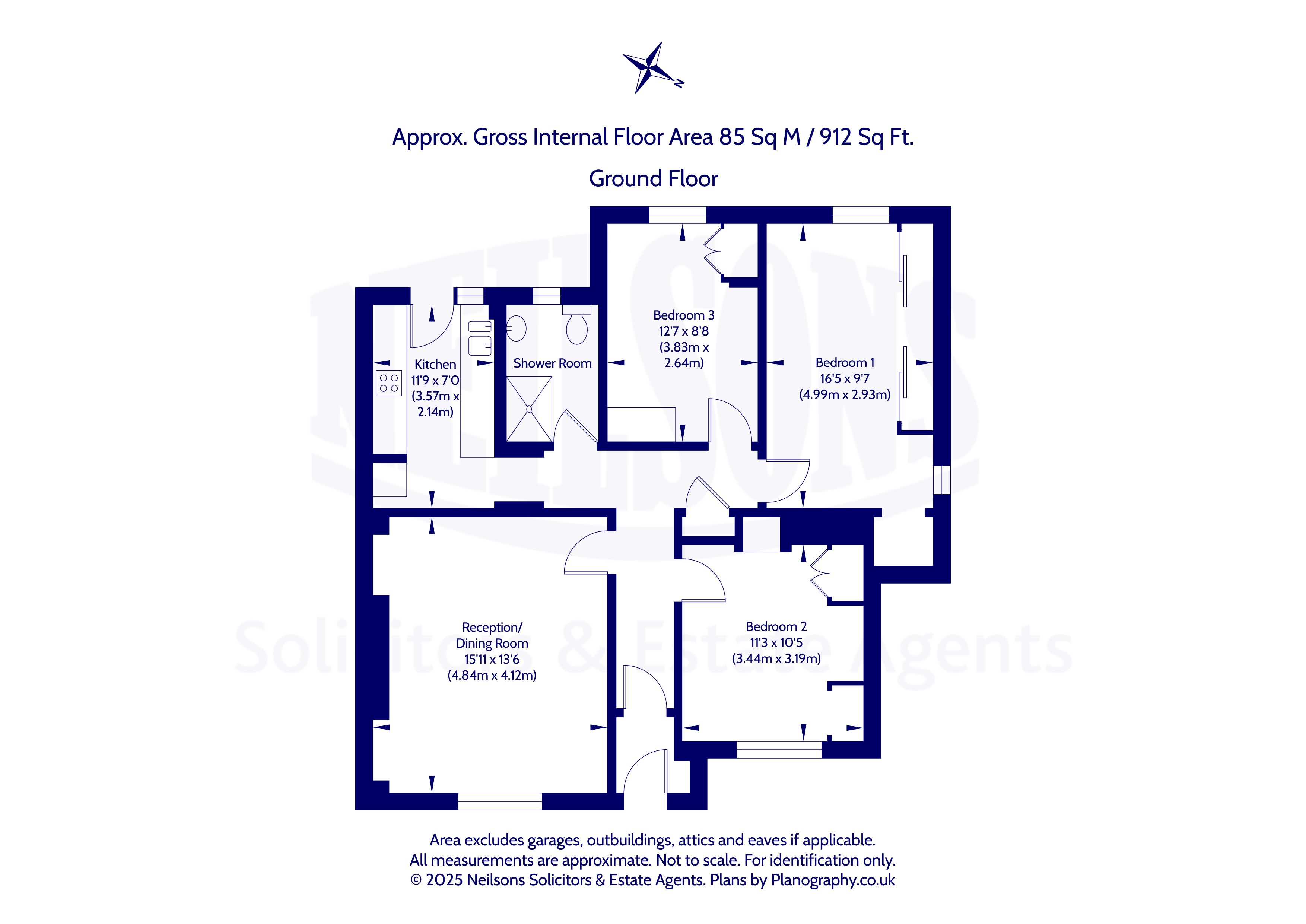 The property is entered via a welcoming hallway with convenient storage. The front-facing reception room is spacious and filled with natural light from a large window, complemented by laminate flooring, creating a comfortable and inviting living space. The galley-style kitchen is located to the rear and features high-gloss white wall and base units, mosaic tiling to splash areas, integrated appliances, and a rear door providing direct access to the garden. The principal bedroom enjoys a dual-aspect outlook to the rear and side, and benefits from built-in storage and fitted wardrobes. The second rear-facing bedroom is flexible in use and is currently arranged as a dining room, while a further double bedroom to the front also includes built-in wardrobe space. The modern shower room is part-tiled and fitted with a crisp white two-piece suite, a walk-in cubicle with a thermostatic rainfall shower, and a heated chrome towel rail.