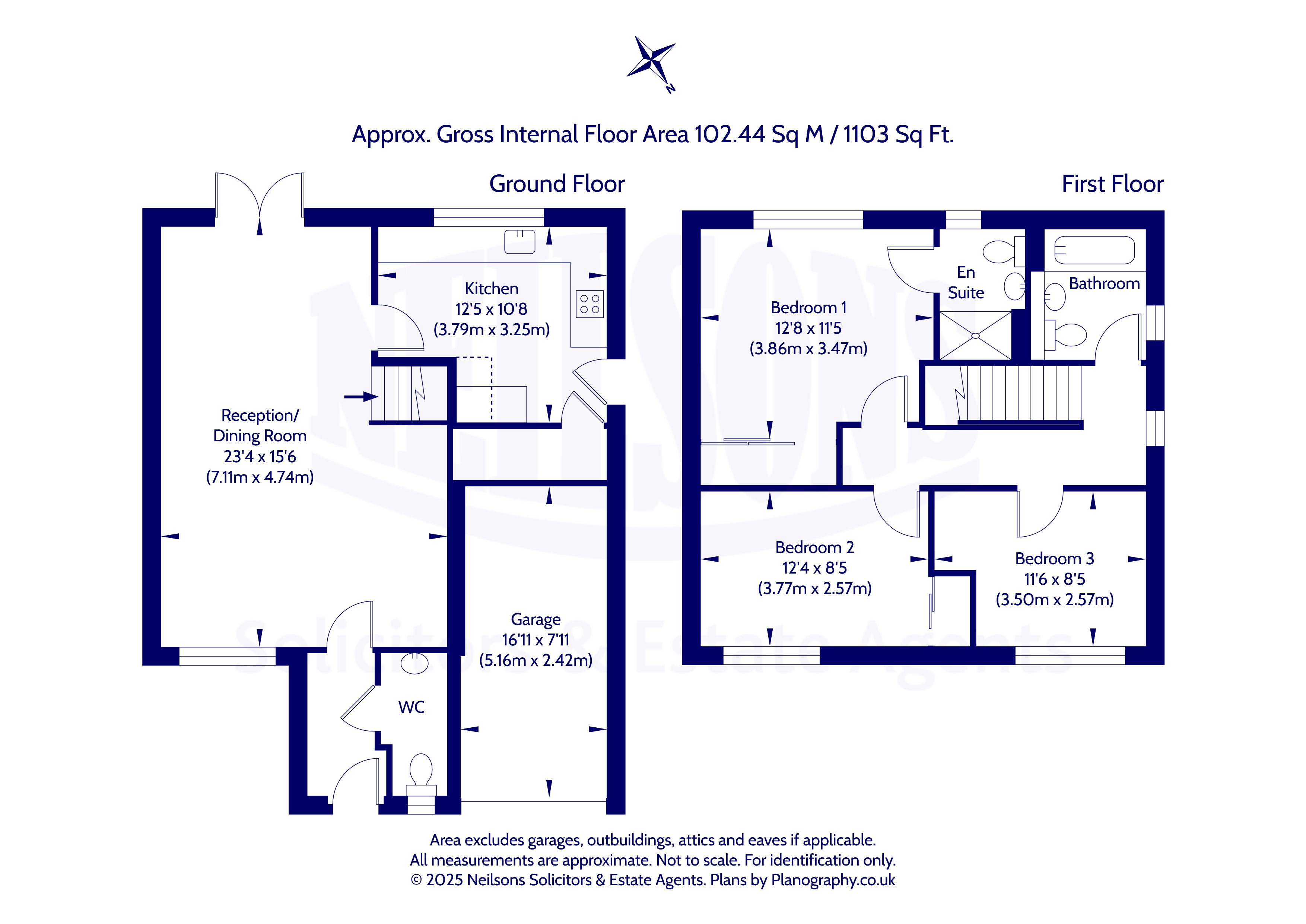 The well-presented accommodation is filled with natural light and opens with a welcoming hallway and guest WC apartment. A spacious dual aspect reception and dining room features French doors to the rear garden, while the modern integrated kitchen includes a large walk-in pantry and access to the side garden. A carpeted staircase leads to the upper floor, where the principal bedroom enjoys built-in wardrobes and an en suite shower room. A further double bedroom with fitted wardrobes, a generous single bedroom and a family bathroom with white three piece suite complete the layout. The property is further enhanced by gas central heating with combi boiler and double glazing.