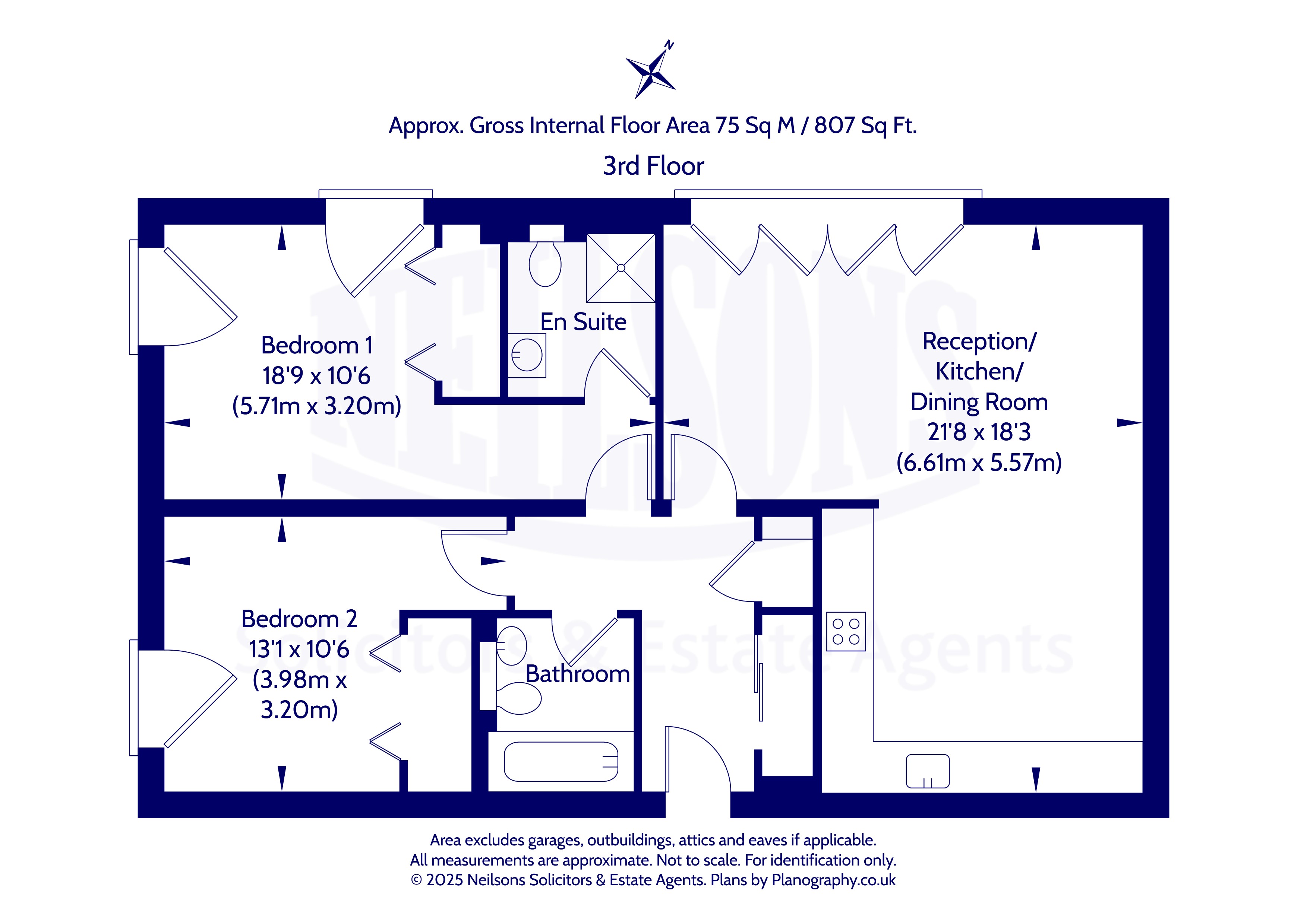 The welcoming hallway provides excellent storage, including a double cloak cupboard housing the meters and a further single cupboard containing the boiler. The impressive open-plan lounge/kitchen/diner offers a smart, fully fitted layout with a range of integrated white goods, sleek units, under-unit lighting, and generous space for both relaxing and dining. Juliet balconies enhance the room with natural light and open views. The principal bedroom is a spacious double with a bright dual aspect, lovely open outlooks, and a built-in wardrobe. The en-suite features partial tiling, a corner shower, a heated towel rail, and contemporary fittings. The second bedroom is also a comfortable double with fitted wardrobes and room for additional freestanding furniture. The main bathroom is finished with partial tiling and includes a shower over the bath.