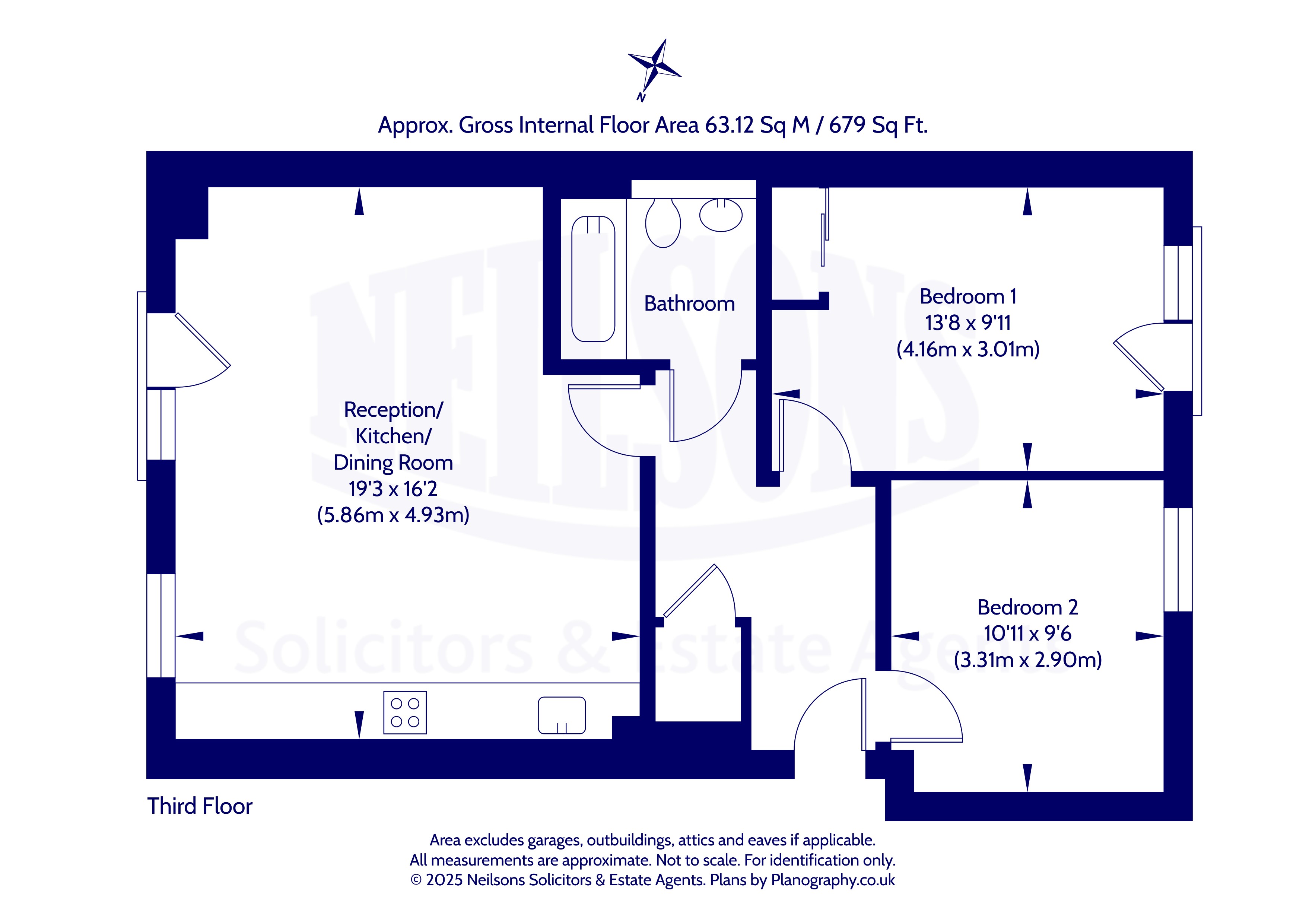 A welcoming entrance hallway with a generous storage cupboard leads to the spacious open-plan lounge, kitchen, and dining area. This bright and versatile living space allows for various layout options and features elegant fitted window shutters and a Juliet balcony. The contemporary kitchen is well-equipped with a range of integrated and freestanding white goods whilst splashback tiling adds a stylish, practical touch. The main bedroom is a good-sized double, complete with built-in mirrored wardrobes, another Juliet balcony, and lovely open views. The second bedroom, also a double, enjoys a rear-facing aspect and is ideal as a guest room or home office. A well-appointed bathroom features a shower-over-bath, heated towel rail, and partial wall tiling for a sleek finish.