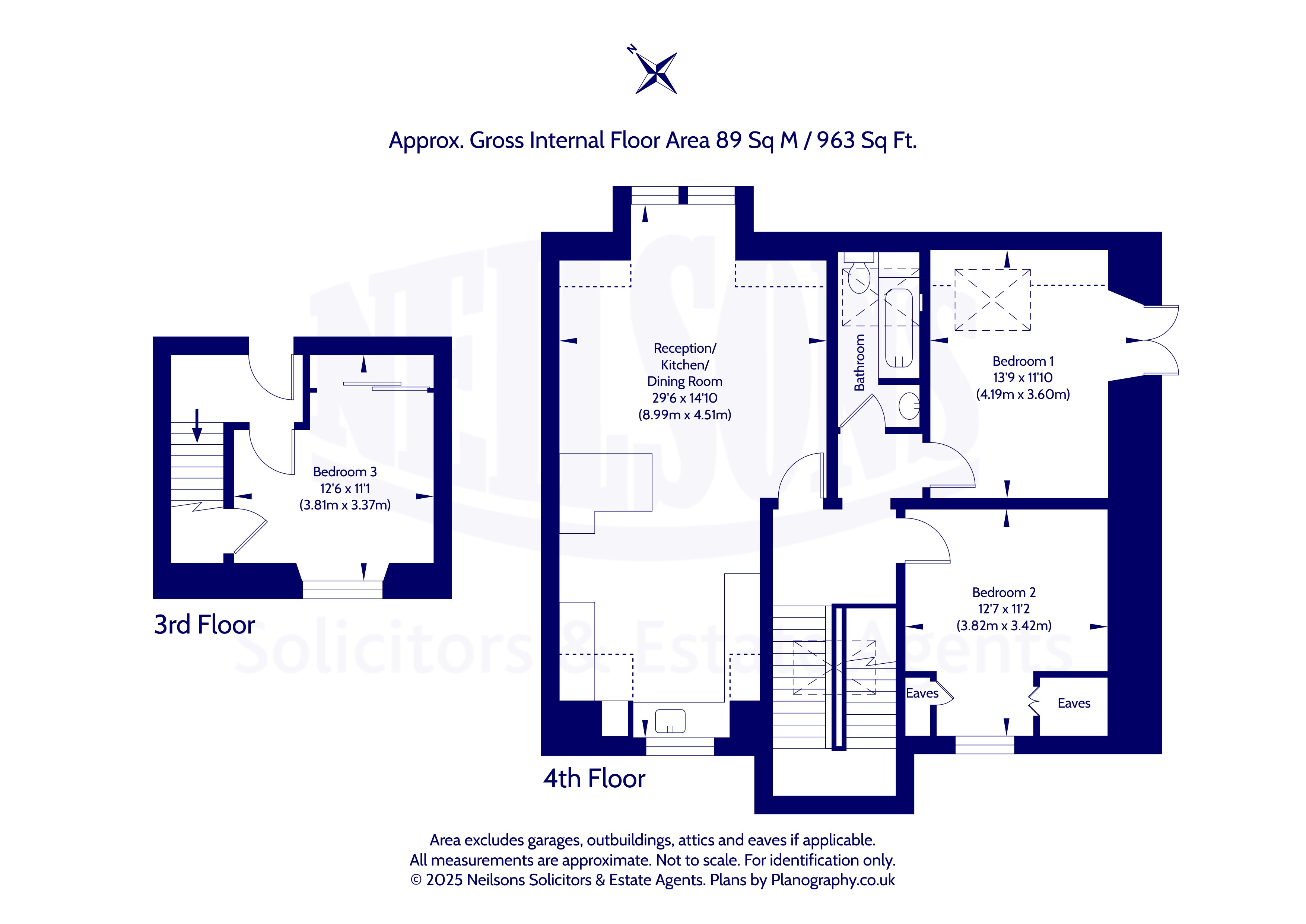 From the secure entrance and communal hallway you enter on the third floor with entrance vestibule and bedroom three which has a built in wardrobe and storage cupboard, and would make an ideal guest bedroom being on its own level. Carpeted stairs lead up to a naturally lit landing and straight ahead is the striking lounge/dining room with views to the Firth of Forth, and is open plan to the modern fitted kitchen with a range of base units with wooden worktops and subway style tiling. The principal bedroom has a velux window and doors opening onto roof space, whilst bedroom two benefits from eaves storage. The luxurious bathroom has a velux window, inset overhead rainfall shower, heated towel rail and underfloor heating. A floored attic with light provides a useful storage space and the property also benefits from gas central heating and double glazing (with the exception of bedroom three).