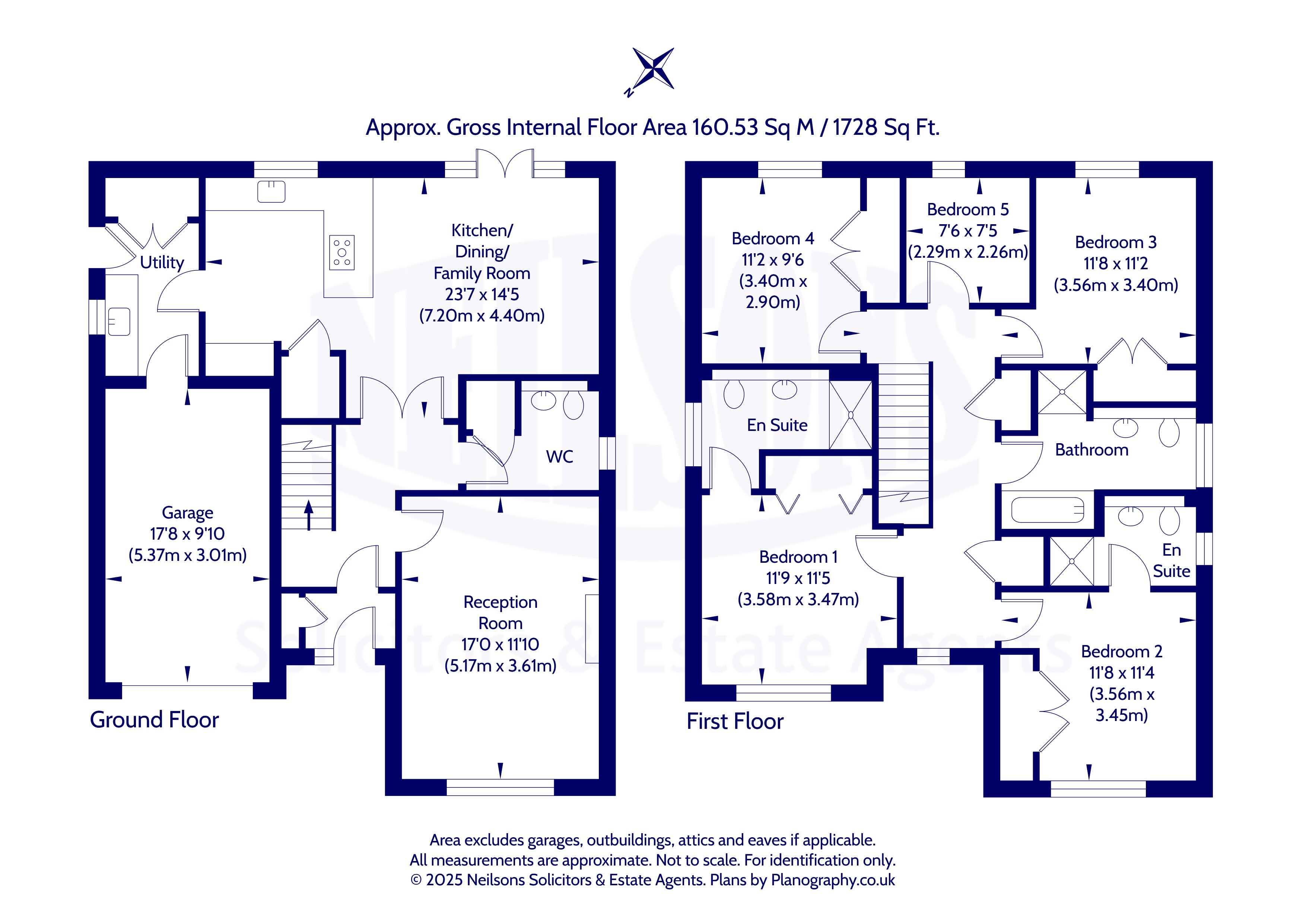 First Floor; landing with attic access and further integrated storage options, large principal double bedroom with integrated wardrobes with folding doors, first partially-tiled en-suite shower room with a double shower cubicle and heated towel rail, second generous double bedroom with more integrated wardrobes, second partially-tiled en-suite shower room, two more double bedrooms with integrated wardrobes and ample room for freestanding furniture, fifth single bedroom offering flexible use as a home office/study, and a partially-tiled family bathroom suite with separate bath and shower.