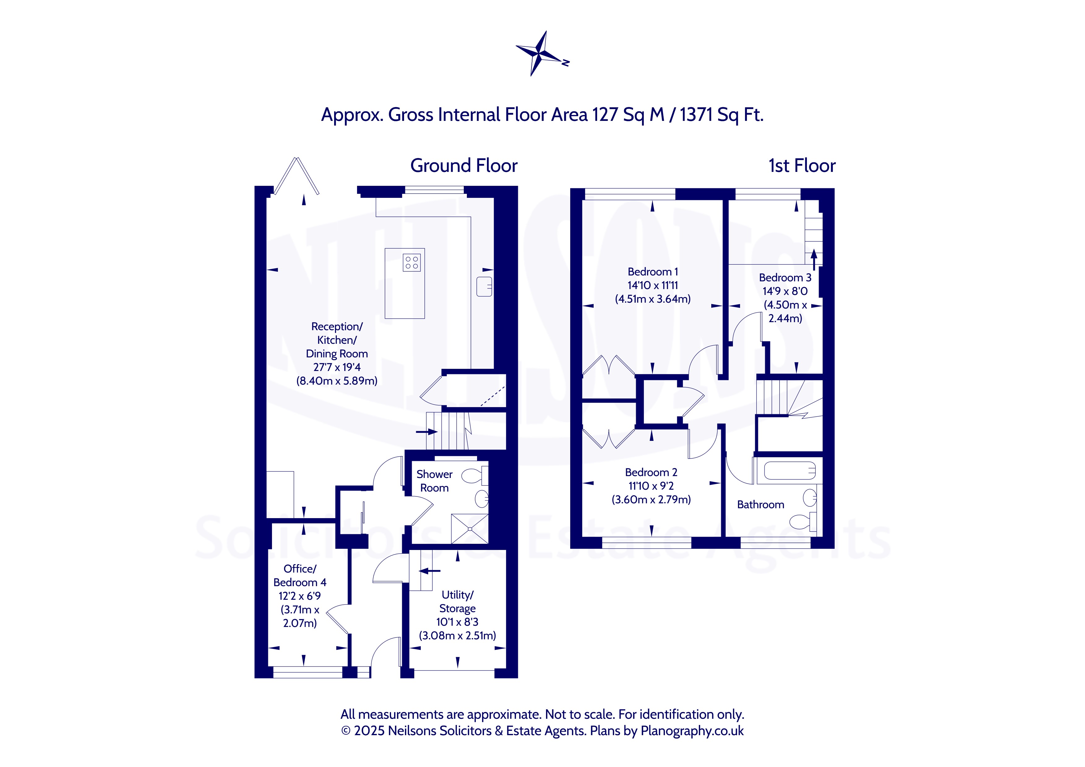 On the upper level there is a generously proportioned west facing principal bedroom with fitted wardrobes, a second spacious double bedroom also with storage, a double bedroom with raised platform bed with space saving integrated storage, and main family bathroom with three-piece white suite, tiling to splash areas and over-bath electric shower.