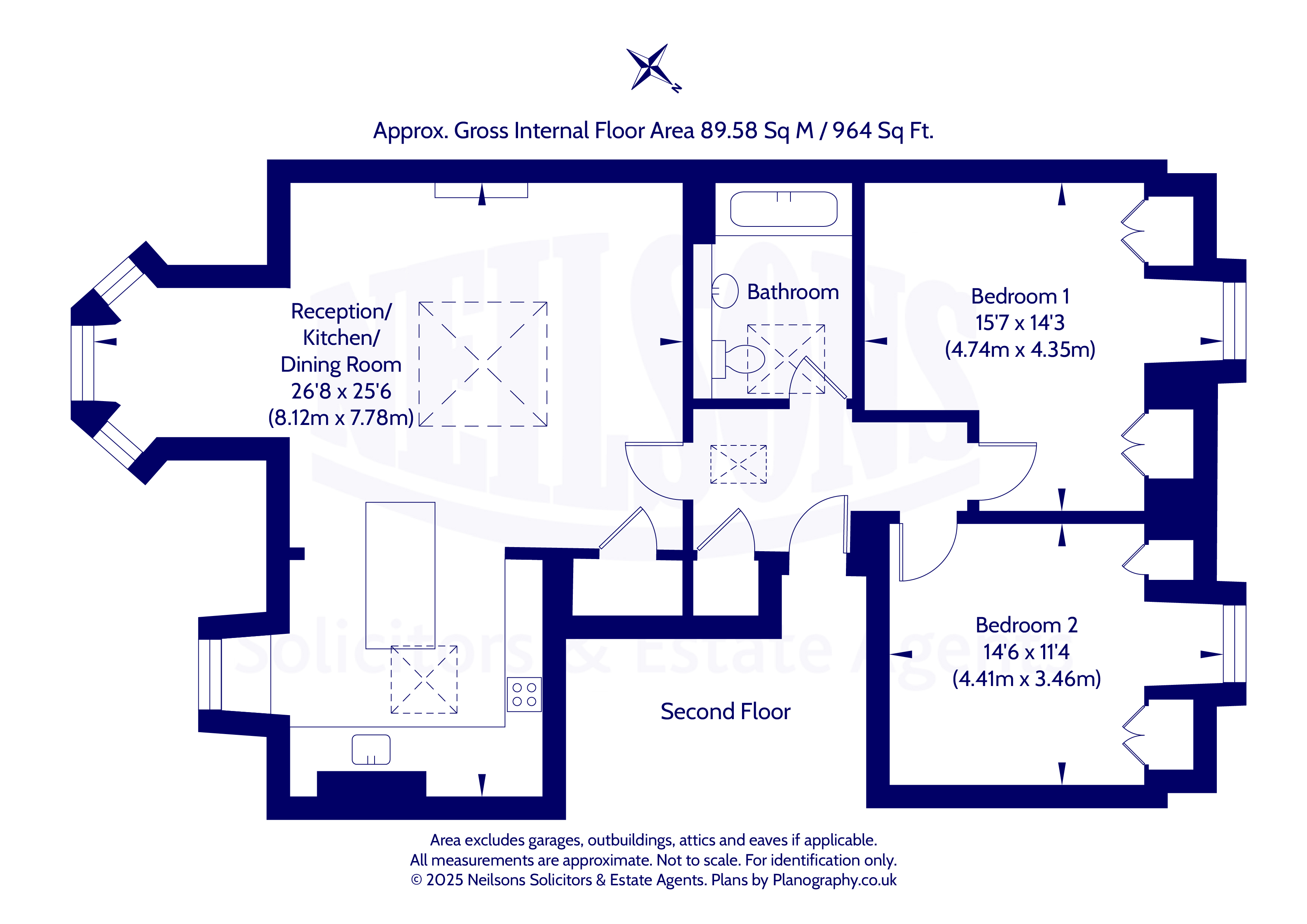 Accessed via a secure and well-maintained communal entrance, this beautifully presented home opens into a welcoming hallway that leads to a stunning open-plan lounge, kitchen, and dining area—the true heart of the property. The lounge boasts a large bay window that floods the space with natural light, a decorative fireplace, a storage cupboard, and ample room for a dining table. Skylights in both the lounge and kitchen area further enhance the bright and airy atmosphere. The bespoke kitchen is thoughtfully designed with an extensive range of oak wall and base units, silestone worktops, tiled splashbacks, and a central island offering additional storage and a casual dining space. At the opposite end of the hallway are two generously sized double bedrooms, each featuring built-in storage. The accommodation is completed by a partially tiled bathroom, fitted with a white suite, a heated towel rail, and a shower over the bath. Additional features include gas central heating, double-glazed sash and case windows, and elegant oak flooring throughout the hallway and main living area.