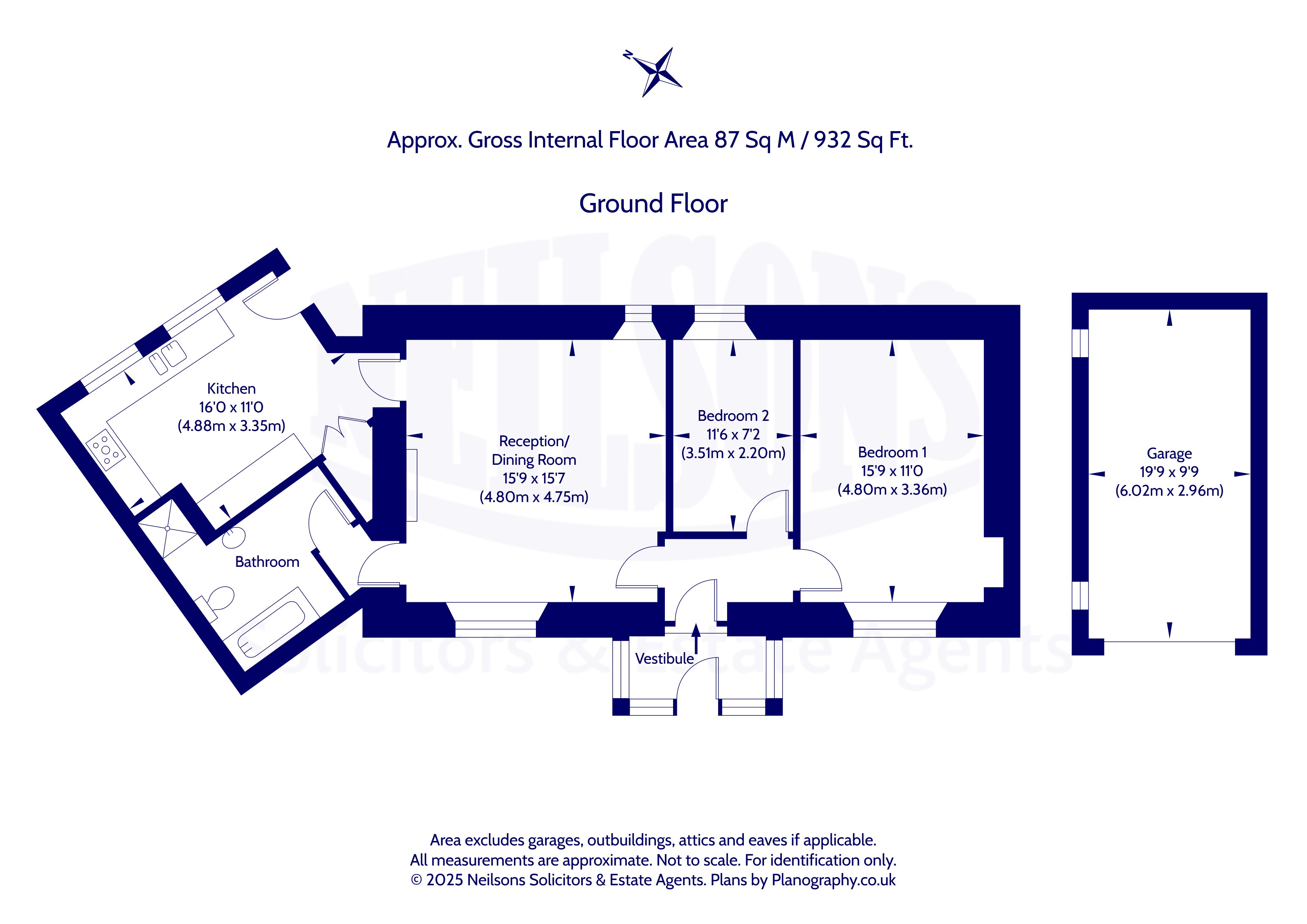 The cottage is set within substantial garden grounds, including a generous front lawn with mature trees and shrubbery, a driveway providing multiple car parking spaces, a single garage, and a private rear courtyard. The extensive grounds offer excellent potential for further development or landscaping, subject to planning consent.